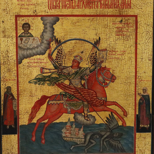 ANTIQUE 19c RUSSIAN PAINTED ICON: Saint Archangel Michael and saints Florus and Laurus | 5231 |