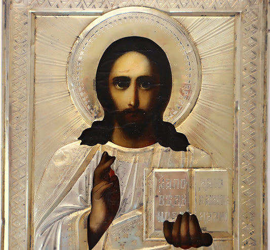 Antiques, Orthodox Russian icon: CHRIST PANTOKRATOR with silver cover. | 5258 |