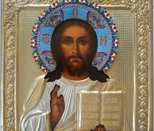 Christian, Orthodox, Russian icon: CHRIST PANTOKRATOR WITH A SILVER-GILT AND CLOISONNE ENAMEL OKLAD |5389 |