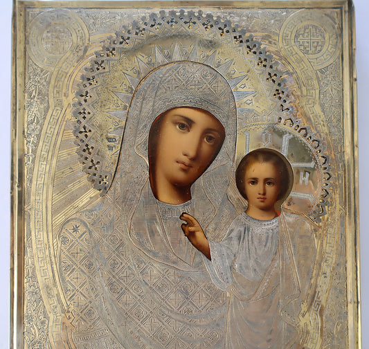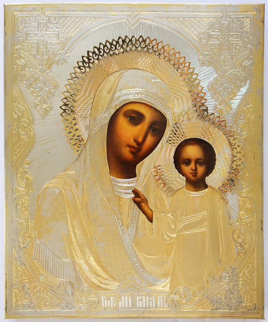 Christian, Orthodox, Russian icon:Mother of God KASAN (KASANSKAJA) with silver gilded oklad |5706 |