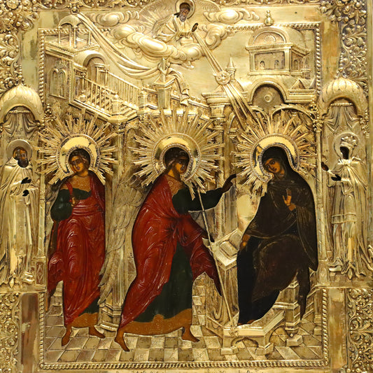ANTIQUE 19c 84 SILVER RUSSIAN PAINTED ICON: THE ANNUNCIATION WITH A SILVER-GILT COVER. | 5136 |