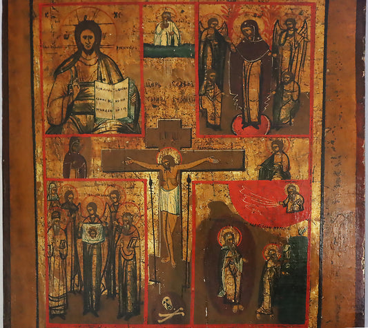 ANTIQUE 19c RUSSIAN PAINTED ICON: Four part of icon with Crucifixion in the center.| 5034 |