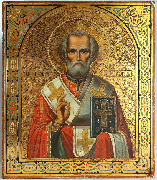 ANTIQUE 19c RUSSIAN PAINTED ICON: St. Nicholas | 5502 |