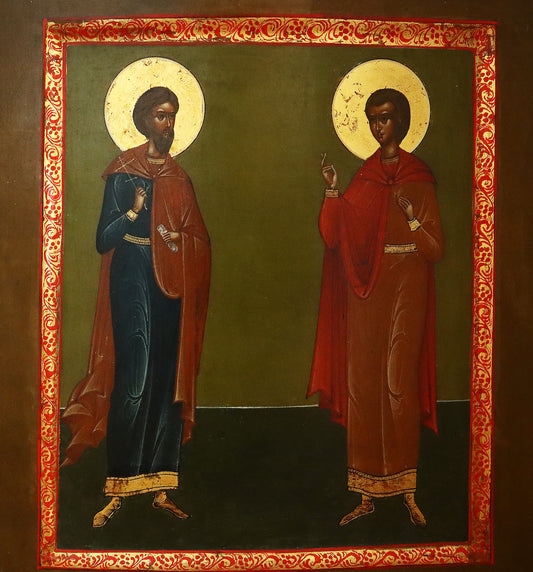ANTIQUE 19c RUSSIAN PAINTED ICON of Martyrs Florus & Laurus | 3957 |