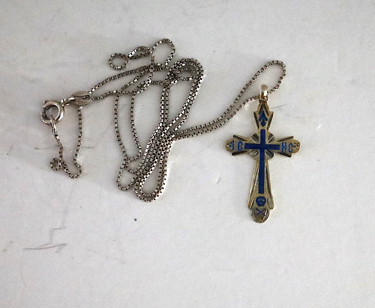 Russian cross with enamel 19th c. on silver chain. St. Pitersburg 1926.