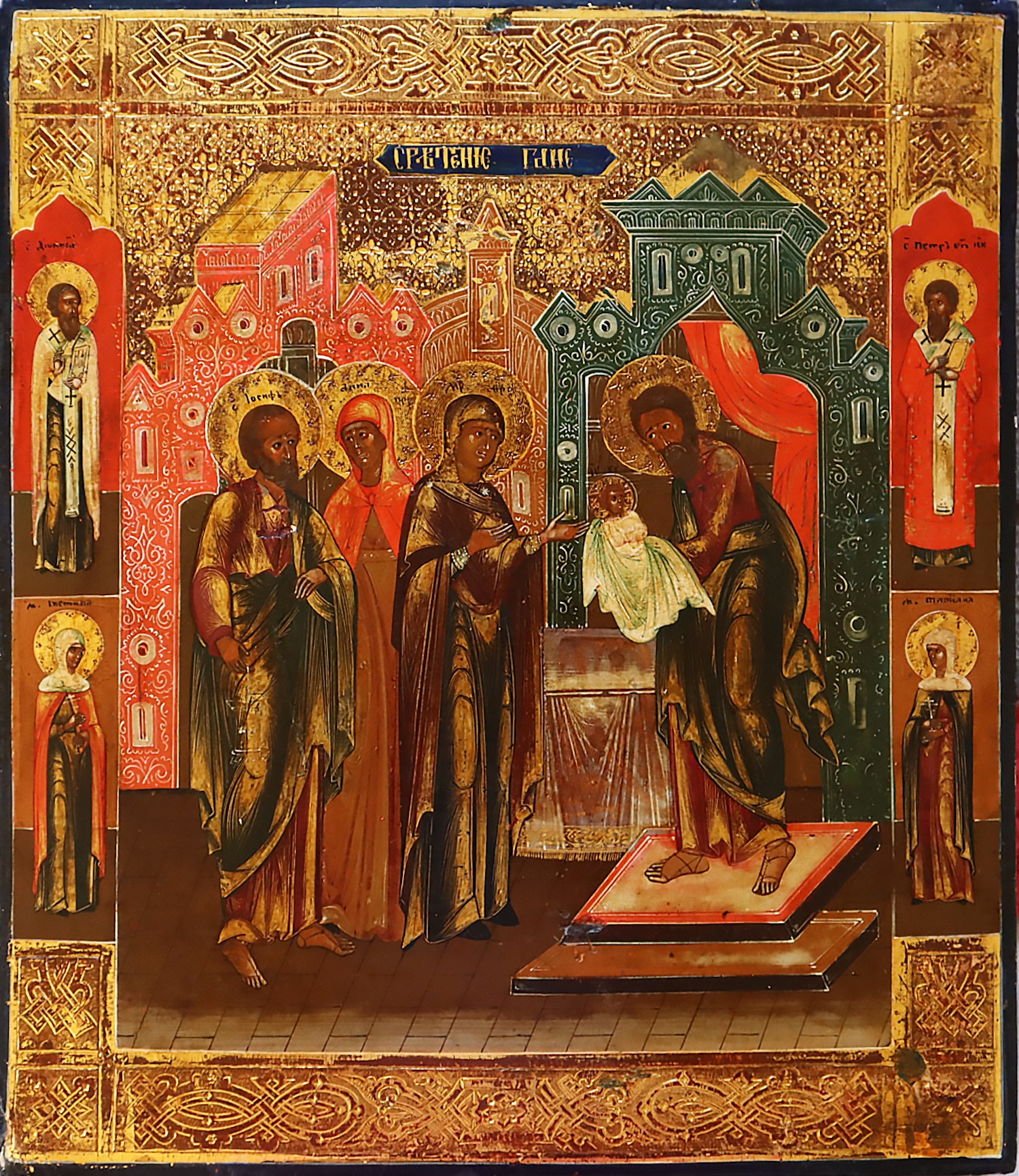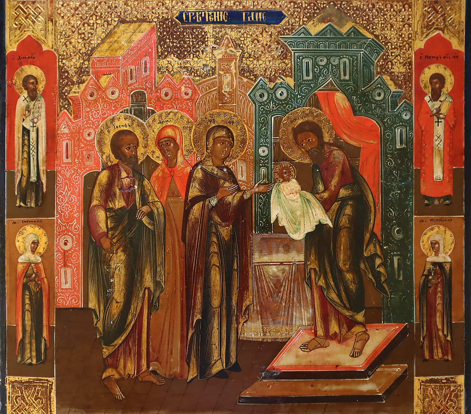 19th century Russian icon The Meeting of the Lord. Mstera rigen. Egg tempera on gesso, on gold leaf on wood panel. The background and border decorated with engraved stylized patterns emulating the metal oklad. Fine and detailed painting, in very good condition. Some loss of gold cover. Board very slightly bowed. Two slats (shponki) in the back (both missing).