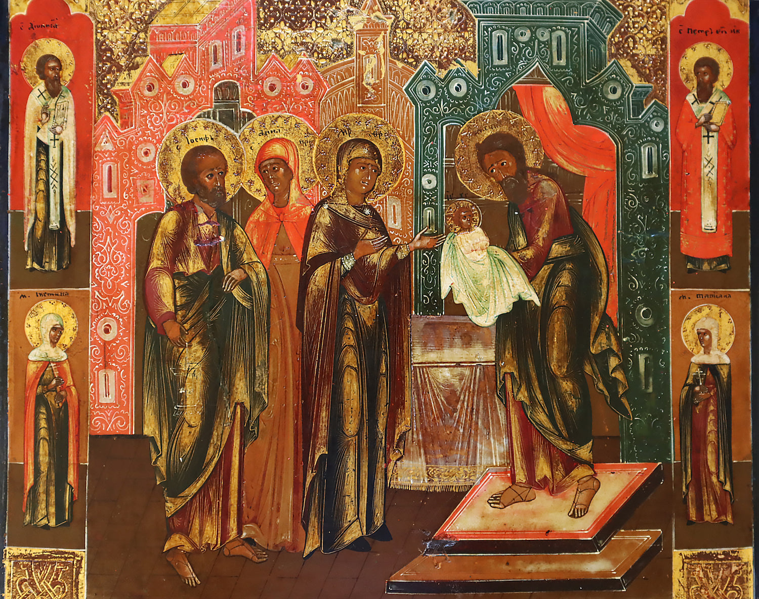 ANTIQUE 19c RUSSIAN PAINTED ICON: The Meeting of the Lord | 5639 |