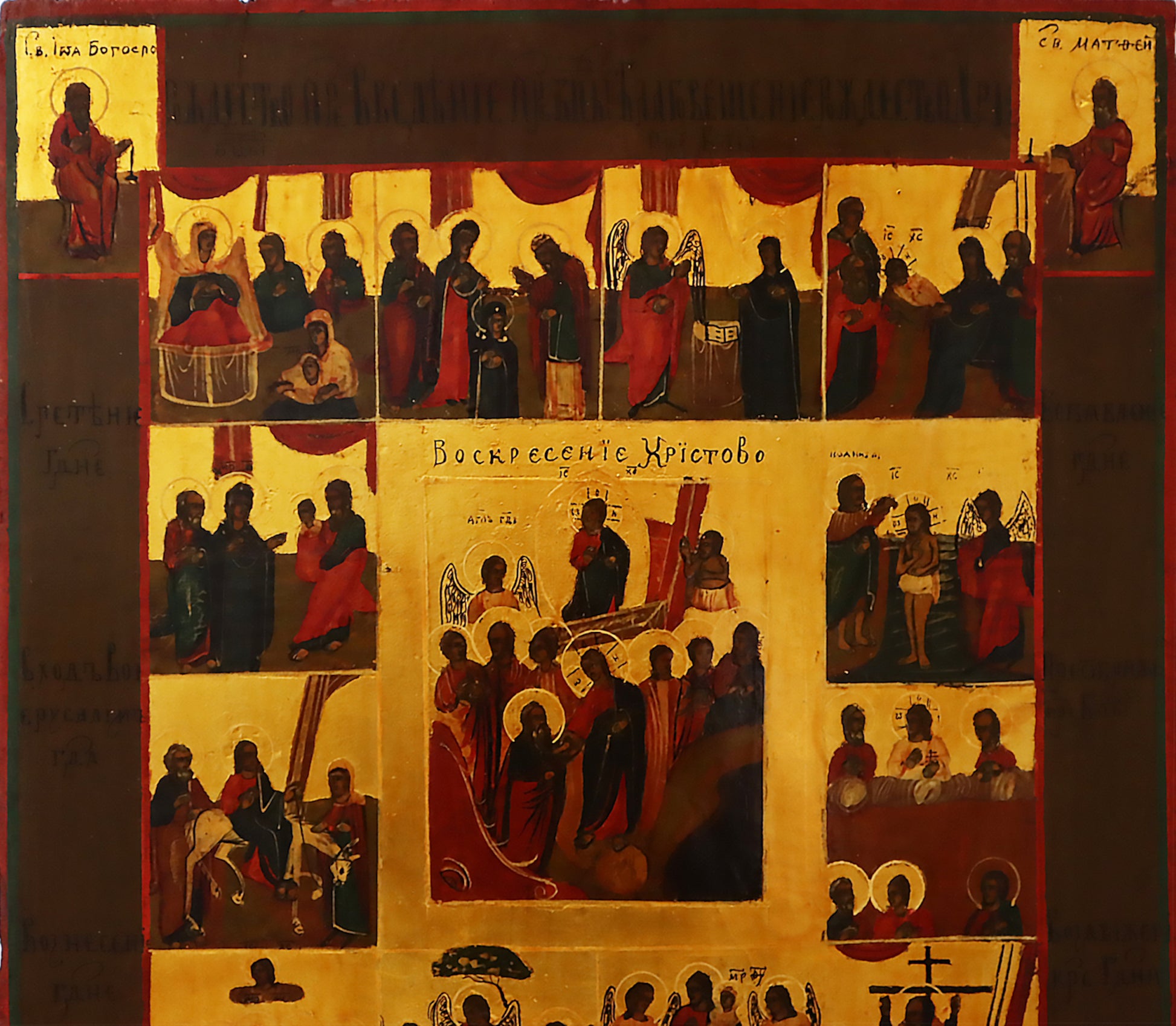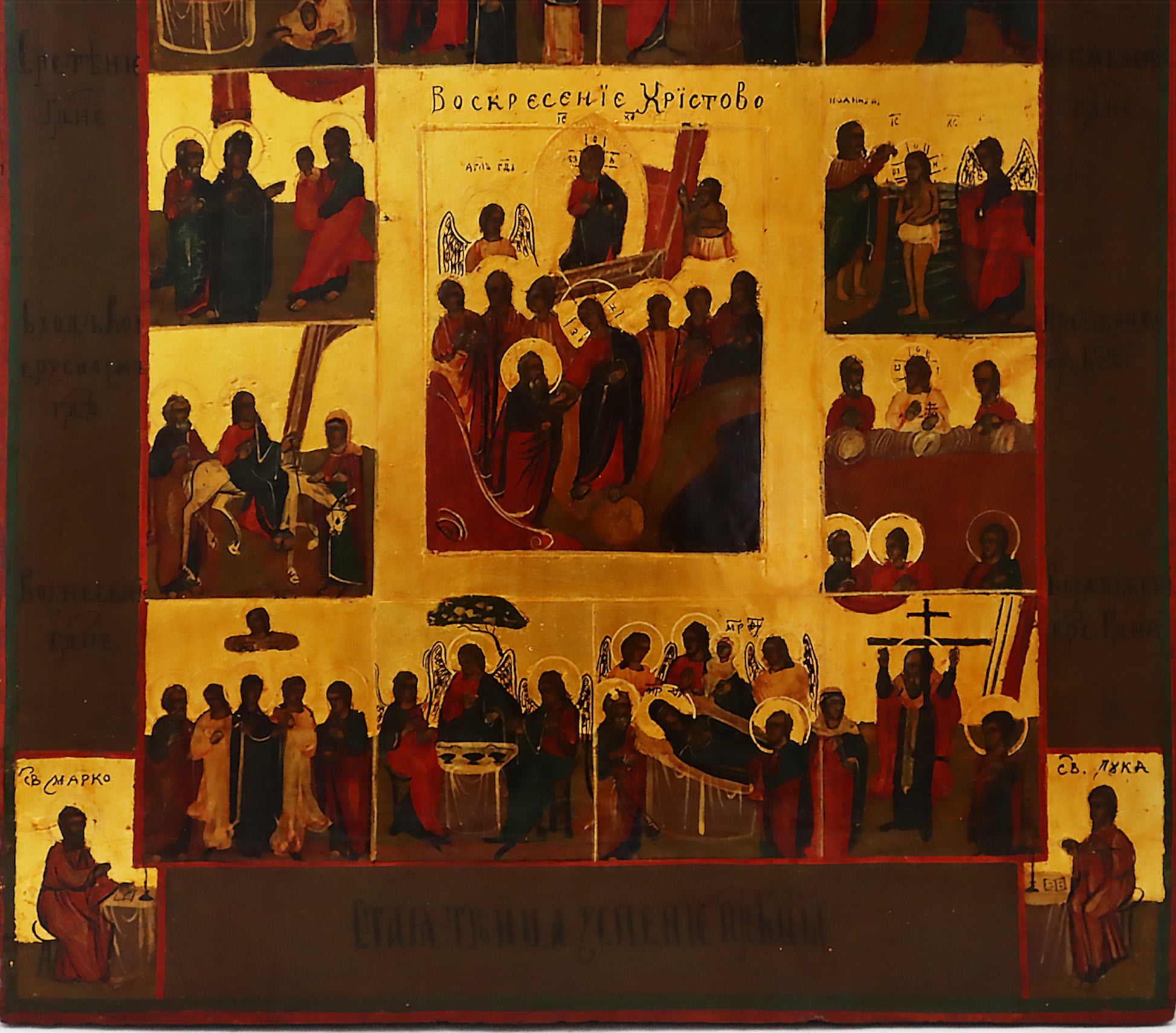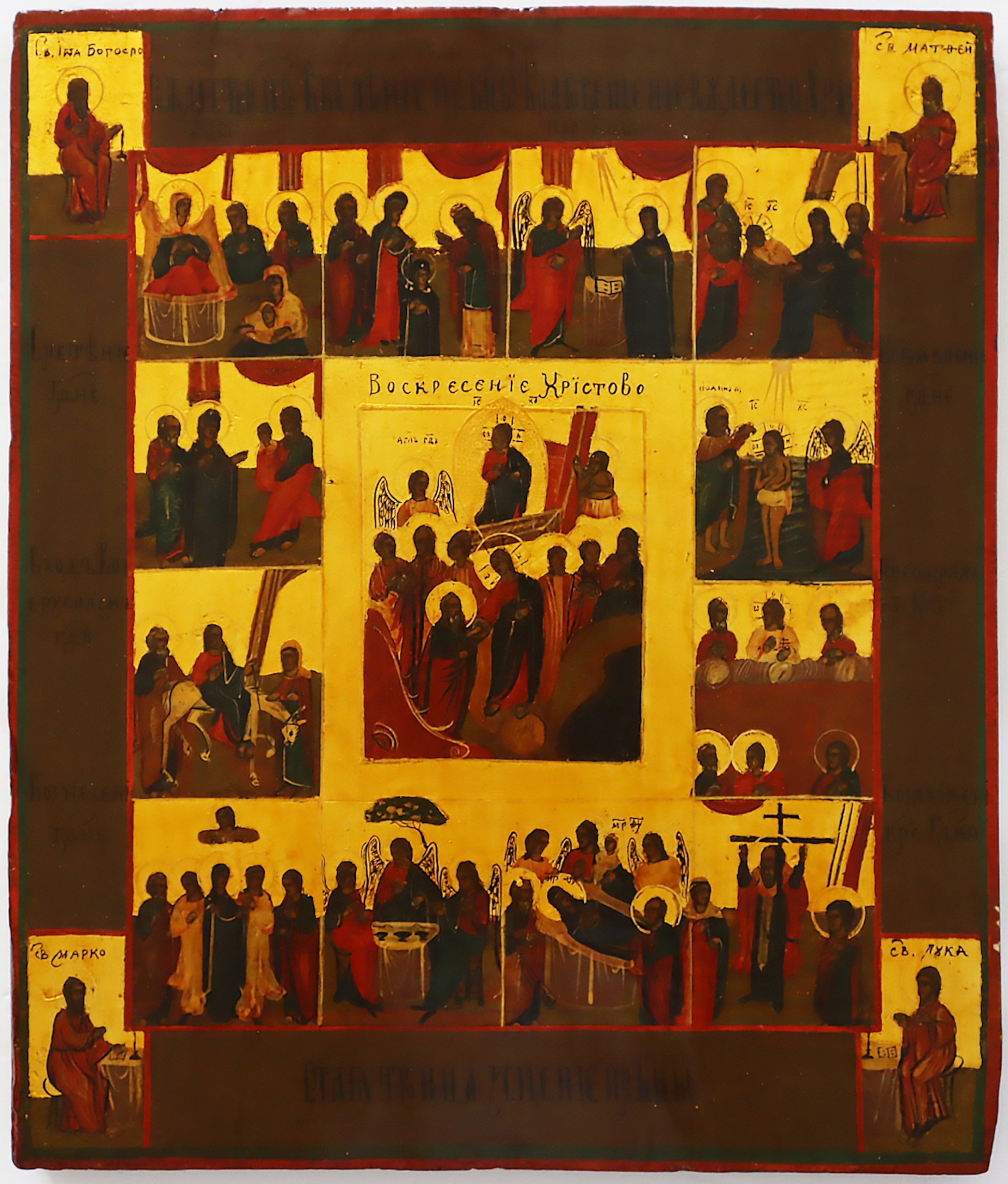 19th century A Feast Days Icon. Russian, Tempera on gesso on wood panel. The background made of silver, covered by a golden lacquer. The corners with the Four Evangelists. Restored. Two splints on the top and bottom.