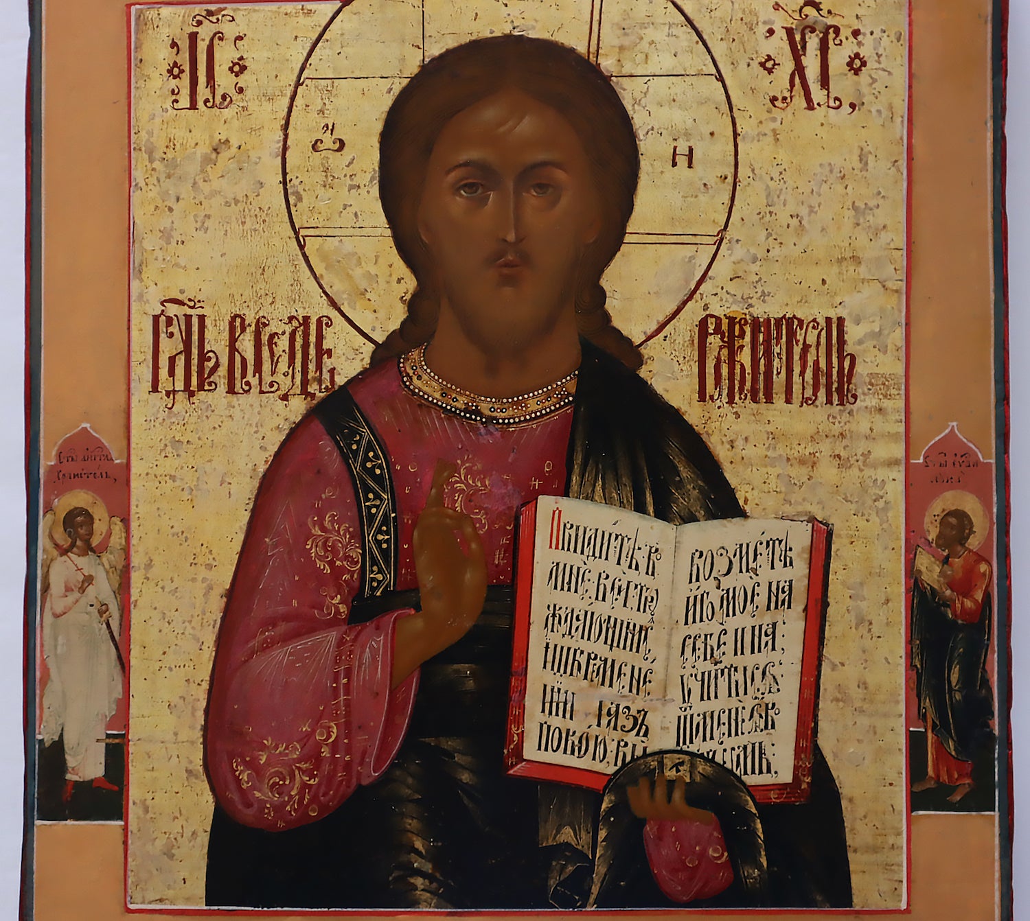 Beginner of 19th century, Russian, Romanov-Borisoglebsk (Old Believers). Egg tempera, gesso, gold leaf on wood panel. Two splints on the back top and bottom. In this half-length form of writing, Jesus Christ holds an open book with the text in full: “ Come by blessed of my Father, inherit the kingdom prepared for you from the foundation of the world”
