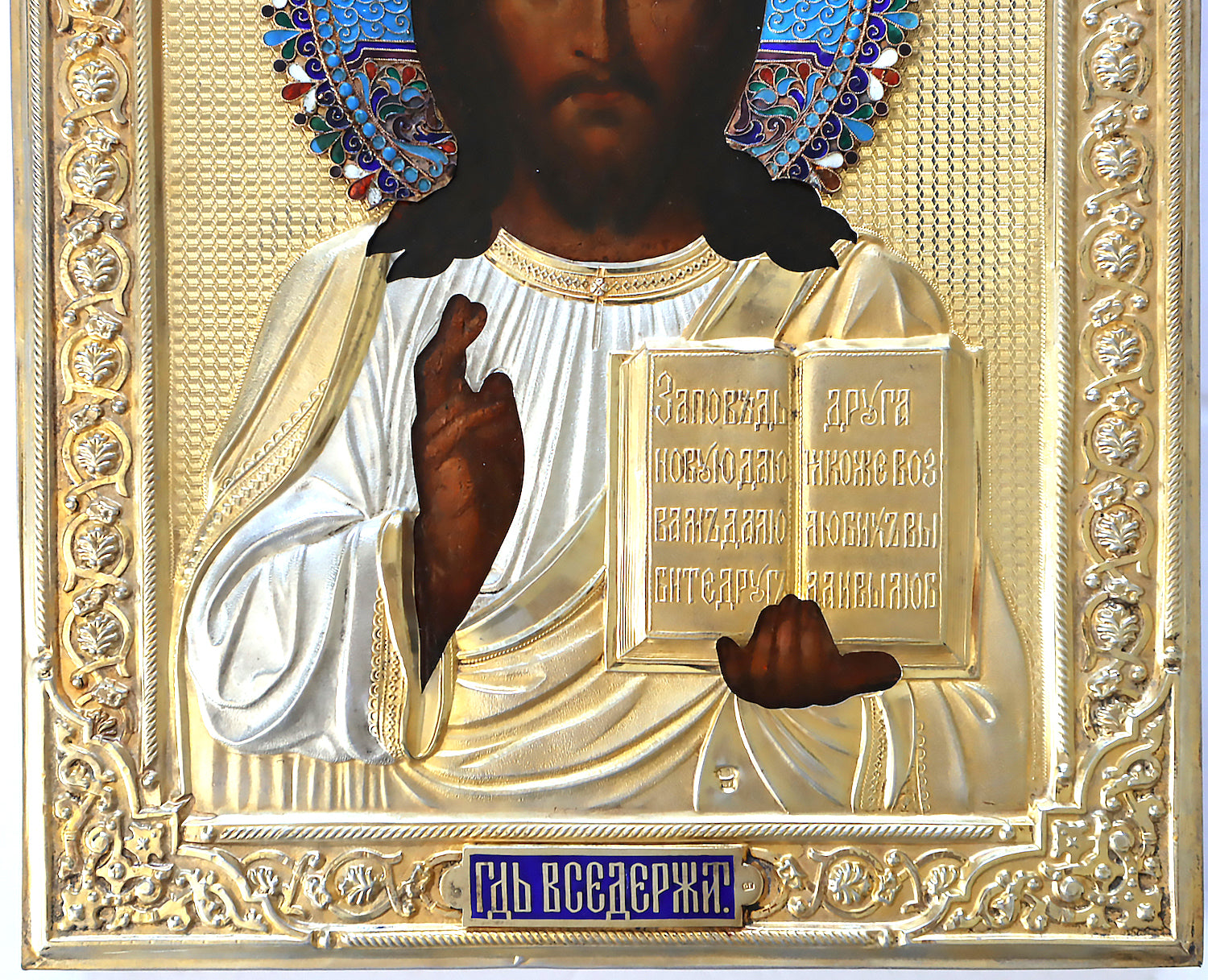 Christian, Orthodox, Russian icon: CHRIST PANTOKRATOR WITH A SILVER-GILT AND CLOISONNE ENAMEL OKLAD |5389 |