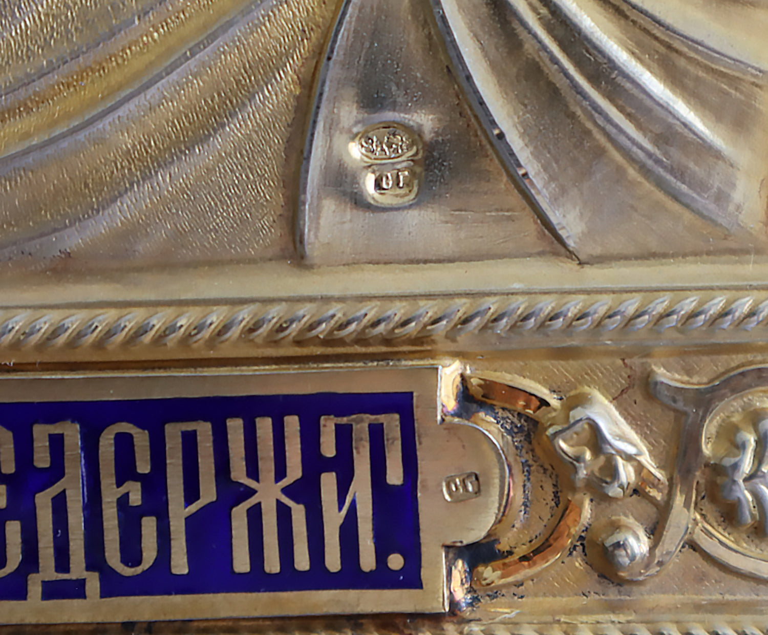 Russian, circa 1900 (icon), Russian, Moscow, Semen Galkin, 1896-1908 (oklad) Oil on wood panel with velvet backing. Overlaid with a silver-gilt oklad. The oklad chased and repousse with a border of palmettes, the halo enamelled, with applied champleve plaque. Marked with assayer's mark, 84 standard and master's mark 'SG' in Cyrillic