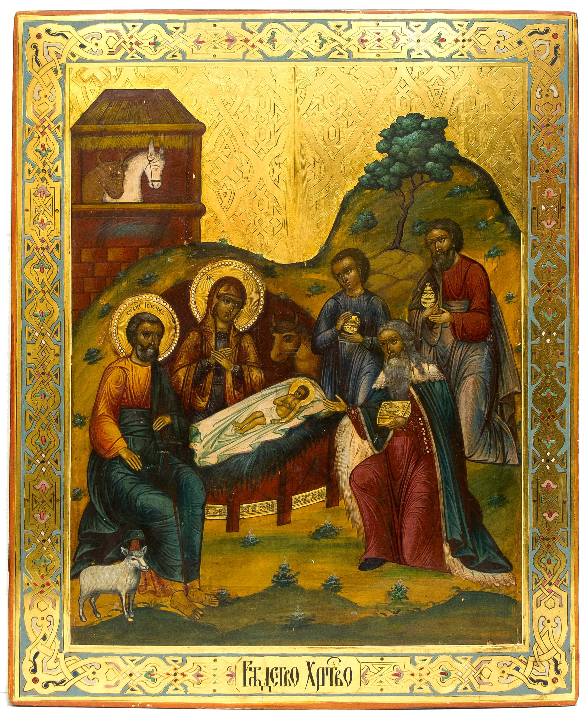 19th century, Russian icon of Nativity of Jesus, Moscow. Egg tempera, gold leaf, and gesso on wood. Simulated enamel on the boarder with decorative monotone pattern in the back ground. Two splints in the back.