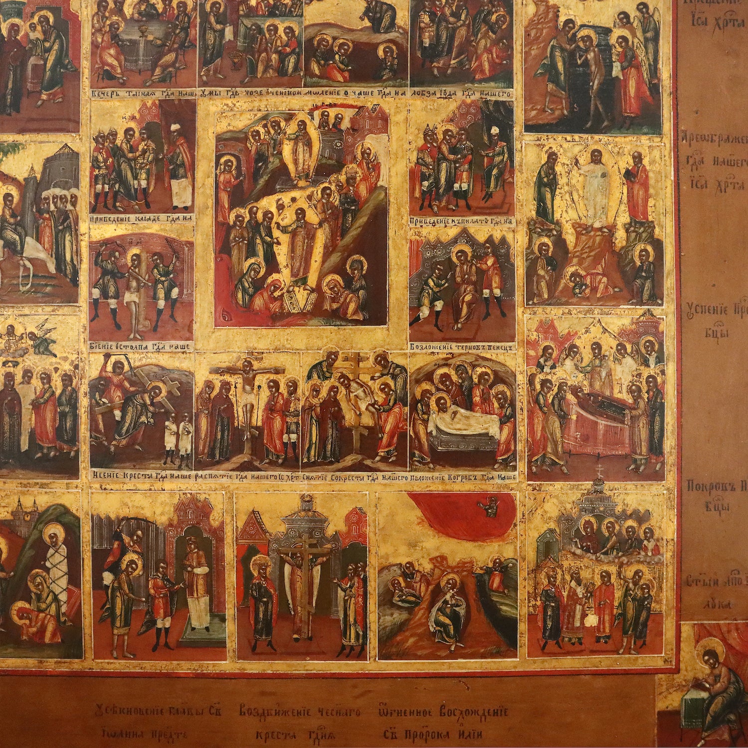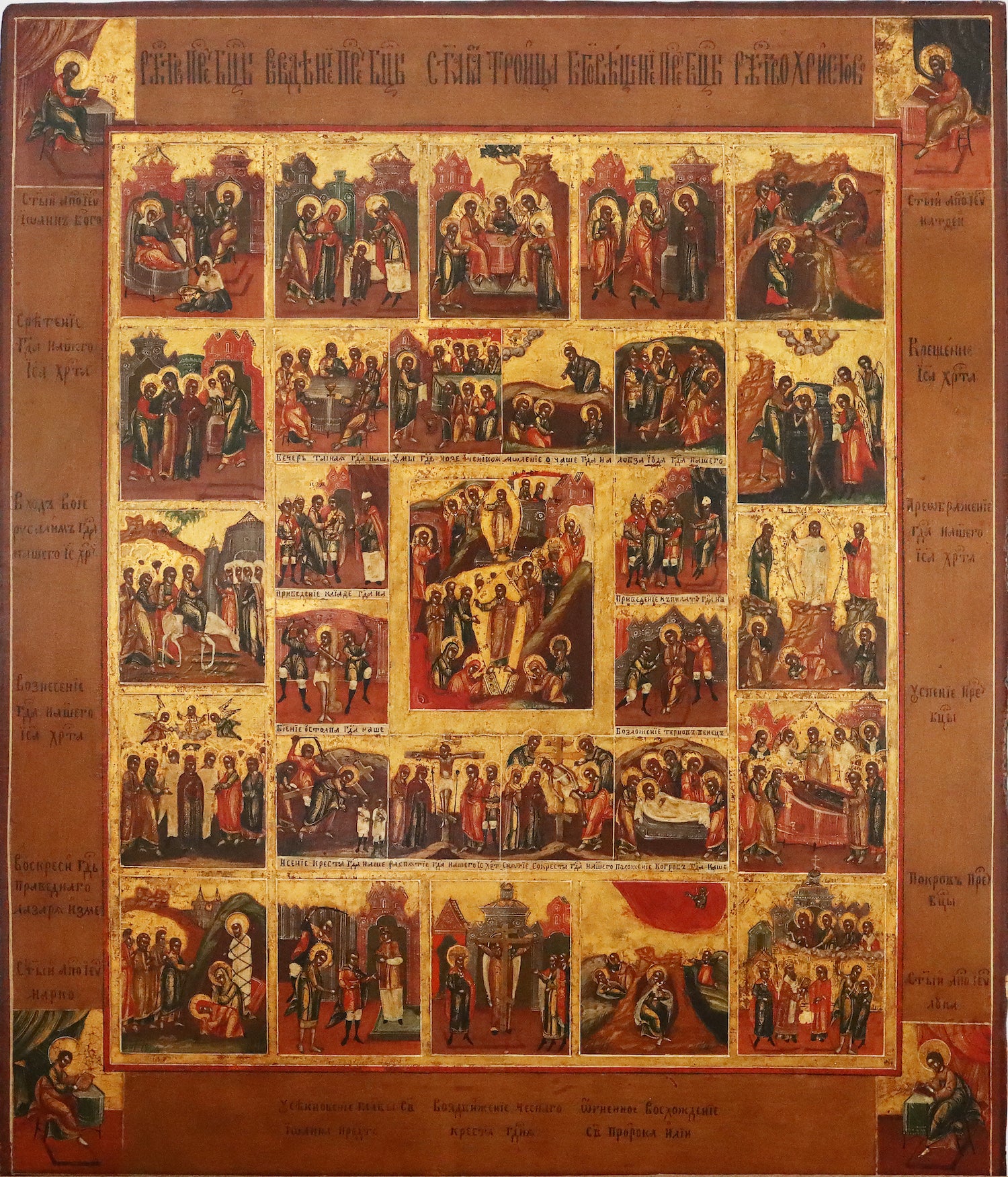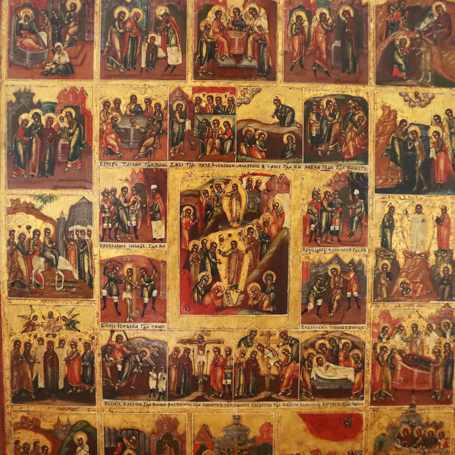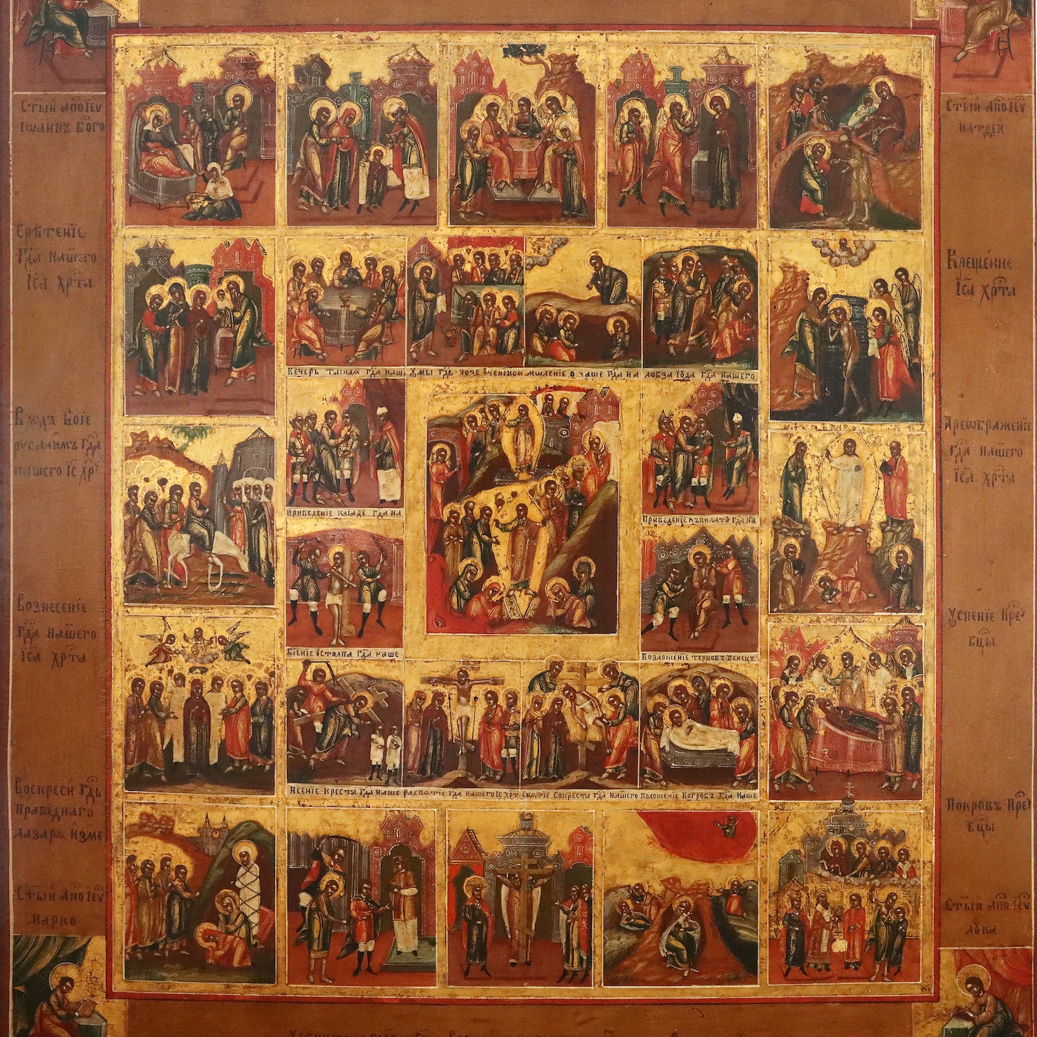 AN ICON SHOWING THE RESURRECTION OF CHRIST AND THE DESCENT INTO HELL WITH THE PASSION CYCLE AND 16 MAIN LITURGICAL FEASTS AND THE EVANGELISTS, Yaroslavl, early 19th century. Tempera on gesso and on wood panel. The background gilded.